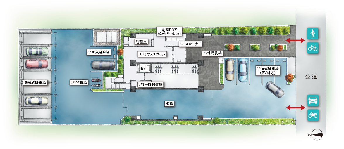 ※掲載のエントランス完成予想図・敷地配置図は、計画段階の図面をもとに書き起こしたものであり、形状・外構・植栽等は実際とは異なります。形状の細部、設備機器、配管等は省略または簡略化の上、表現しております。今後、行政指導、施工上の理由等により、計画に変更が生じる場合があります。