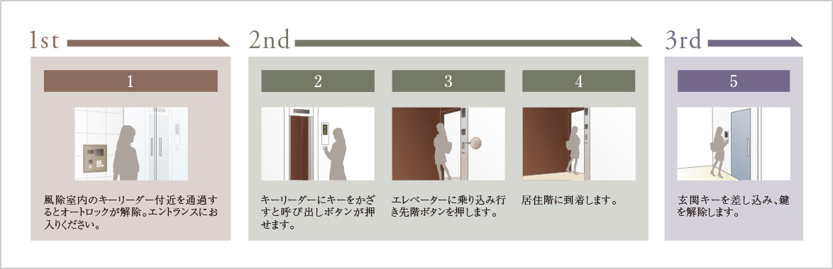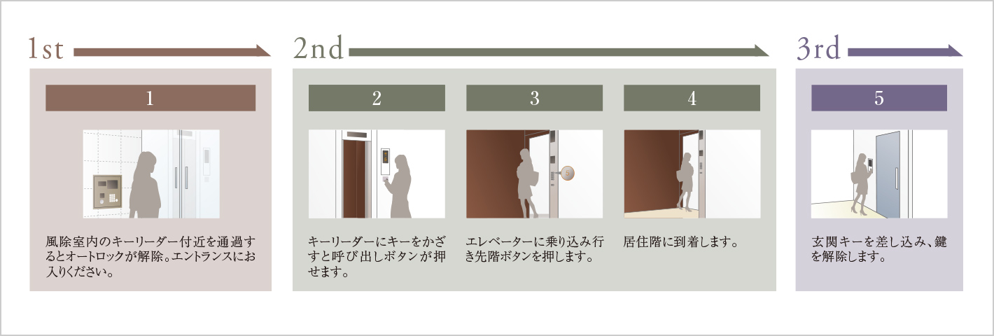 風除室、エレベーター、住戸玄関でチェックする3重のセキュリティシステムを導入。エレベーターには、非接触キーを用いた照合機能を採用しています。